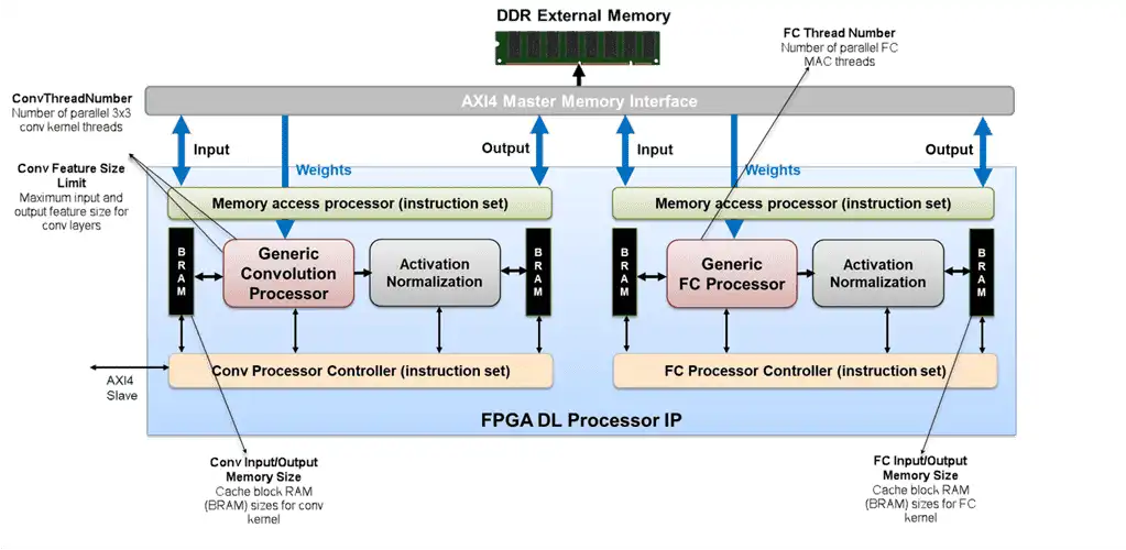 You can store the input images, the weights, and the output images in the external DDR memory. The processor consists of four AXI4 Master interfaces that communicate with the external memory. Using one of the AXI4 Master interfaces, you can load the input images onto the Block RAM (BRAM). The Block RAM provides the activations to the Generic Convolution Processor.