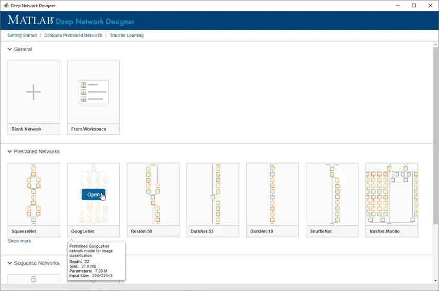 Load a pretrained GoogLeNet network by selecting it from the Deep Network Designer start page. If you need to download the network, then click Install to open the Add-On Explorer.