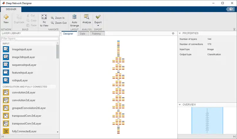 Deep Network Designer displays a zoomed-out view of the whole network. Explore the network plot. To zoom in with the mouse, use Ctrl+scroll wheel.