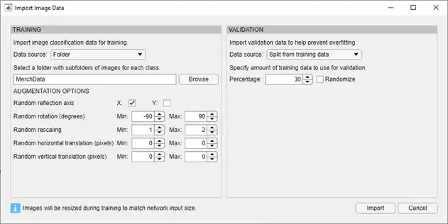 The dialog box also allows you to split the validation data from within the app. Divide the data into 70% training data and 30% validation data.
