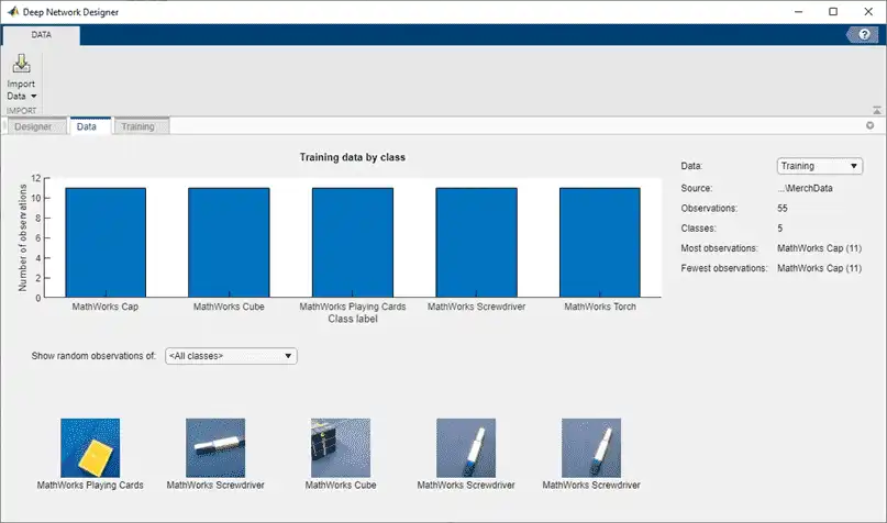 Using Deep Network Designer, you can visually inspect the distribution of the training and validation data in the Data pane. You can see that, in this example, there are five classes in the data set. You can also view random observations from each class.
