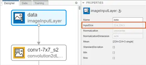 Deep Network Designer resizes the images during training to match the network input size. To view the network input size, on the Designer pane, click the imageInputLayer. This network has an input size of 224-by-224.