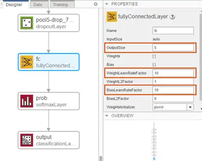 In the Designer pane, drag a new fullyConnectedLayer from the Layer Library onto the canvas. Set OutputSize to the number of classes in the new data, in this example, 5.