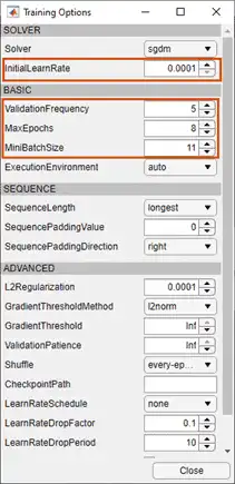 If you want greater control over the training, click Training Options and choose the settings to train with. The default training options are better suited for large data sets. For small data sets, use smaller values for the mini-batch size and the validation frequency. For more information on selecting training options, see trainingOptions.