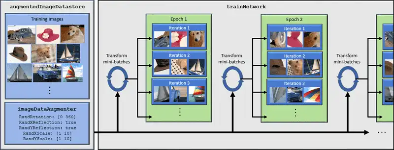 The diagram shows how trainNetwork uses an augmented image datastore to transform training data for each epoch. When you use data augmentation, one randomly augmented version of each image is used during each epoch of training. For an example of the workflow, see Train Network with Augmented Images.
