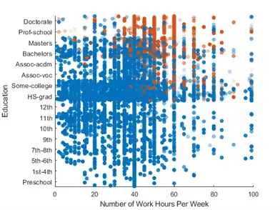 scatter(adulttest.hours_per_week,adulttest.education,[],labels, ...