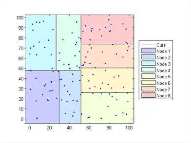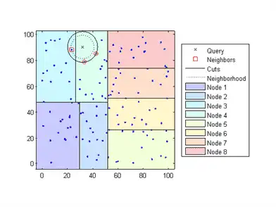 Kd-trees divide your data into nodes with at most BucketSize (default is 50) points per node, based on coordinates (as opposed to categories). The following diagrams illustrate this concept using patch objects to color code the different “buckets.”