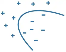 An SVM classifies data by finding the linear decision boundary (hyperplane) that separates all data points of one class from those of the other class. The best hyperplane for an SVM is the one with the largest margin between the two classes, when the data is linearly separable. If the data is not linearly separable, a loss function is used to penalize points on the wrong side of the hyperplane. SVMs sometimes use a kernel transform to transform nonlinearly separable data into higher dimensions where a linear decision boundary can be found. | fitcsvm |