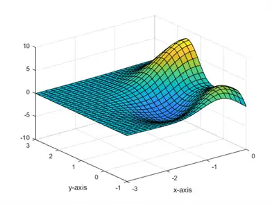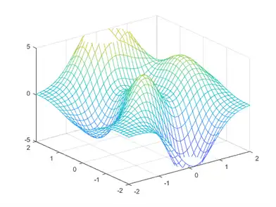 [X,Y,Z] = peaks; mesh(X,Y,Z) xlim ([- 2 2]) ylim ([- 2 2]) evil ([- 5 5])