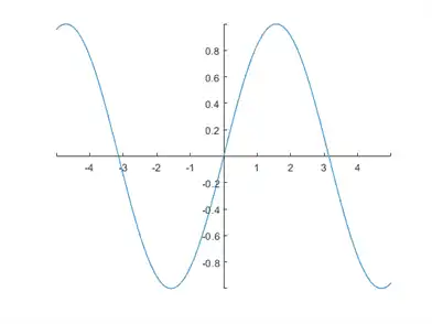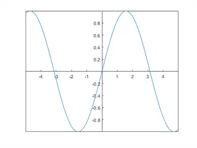 x = linspace(-5,5); y = sin (x); plot(x,y) ax = gca; ax.XAxisLocation = 'origin'; ax.YAxisLocation = 'origin';