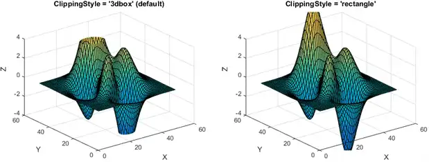 Use the ClippingStyle property to control the way clipping works. If the ClippingStyle is set to '3dbox', then MATLAB clips the plots to the volume defined by the limits of the x, y, and z axes. If the ClippingStyle is set to 'rectangle', then MATLAB clips the plots to an imaginary rectangle drawn around the outside of the x, y, and z axes. The plots below show the difference between the two clipping styles.