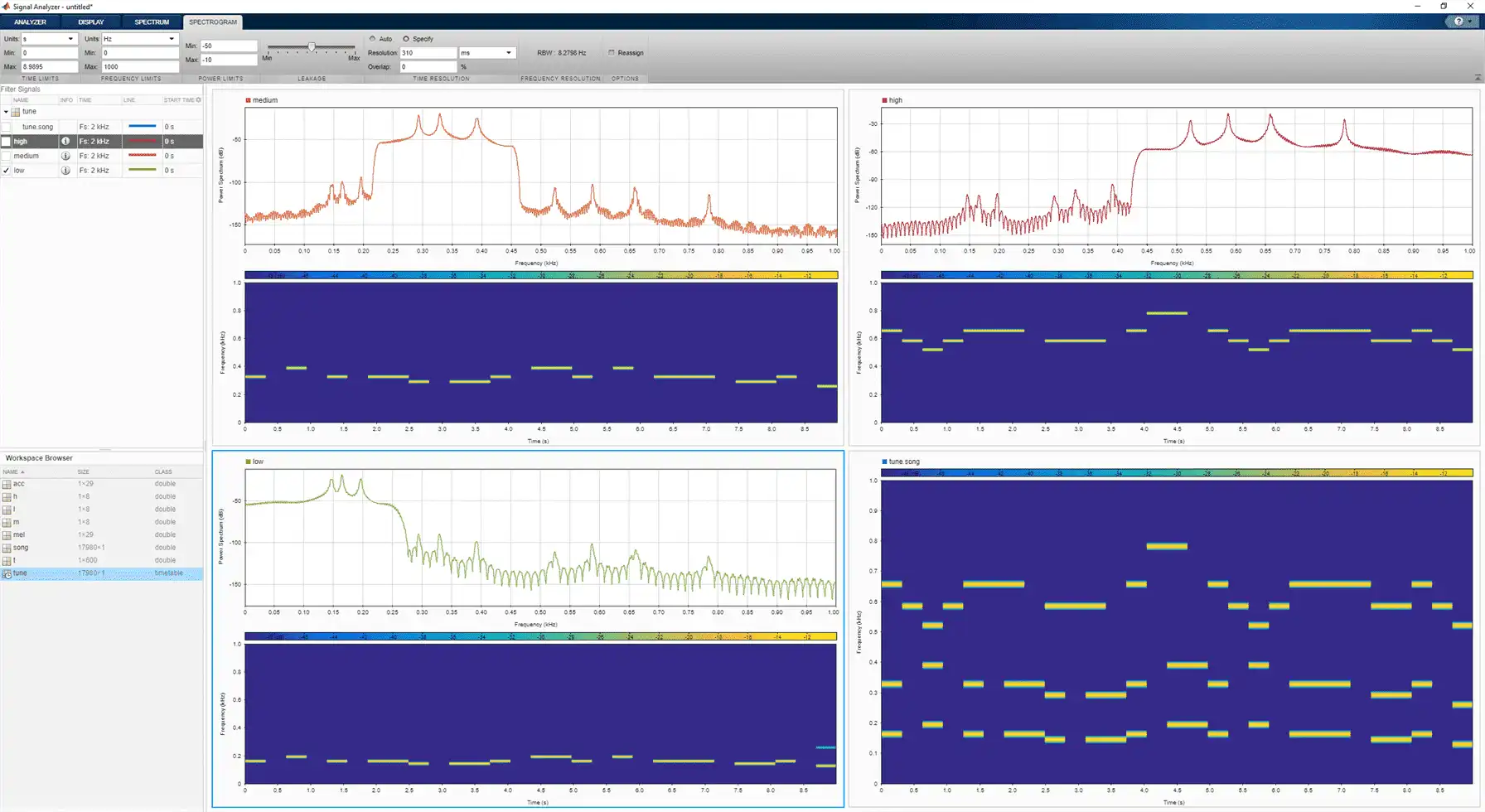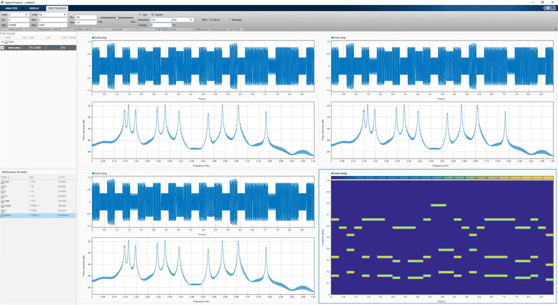 Open Signal Analyzer and drag the timetable from the Workspace browser to the Signal table. Click Display Grid ? to create a two-by-two grid of displays. Select the top two displays and the lower left display and click the Spectrum button to add a spectrum view. Select the lower right display, click Time-Frequency to add a spectrogram view, and click Time to remove the time view. Drag the song to all four displays. Select the lower right display, and in the Spectrogram tab, specify a time resolution of 0.31 second (310 ms) and 0% overlap between adjoining segments. Set the Power Limits to −50 dB and −10 dB.