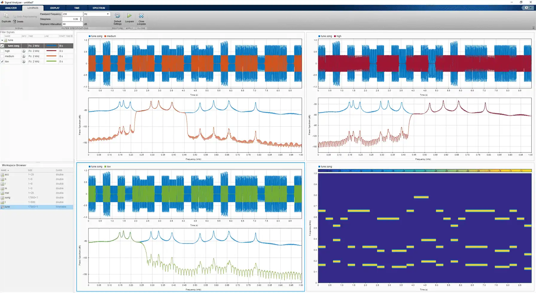 Select the low signal by clicking its name in the Signal table. On the Analyzer tab, click Lowpass. On the Lowpass tab that appears, enter a passband frequency of 230 Hz and increase the steepness to 0.95. Click Lowpass.