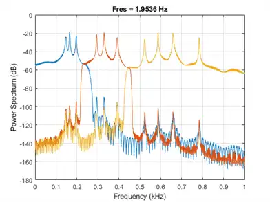 Select the three filtered signals by clicking their Name column in the Signal table. On the Analyzer tab, click Export and save the signals to a MAT-file called music.mat. In MATLAB, load the file to the workspace. Plot the spectra of the three signals.
