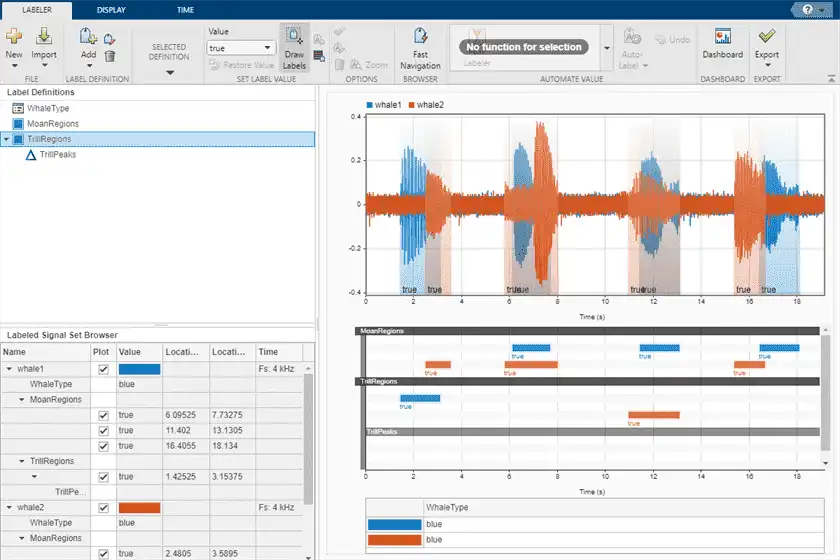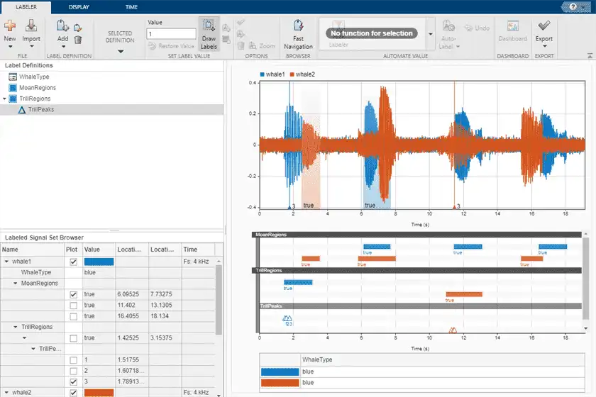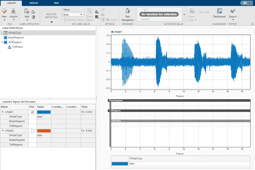 Recordings of whale songs contain trills and moans. Trills sound like series of clicks. Moans are low-frequency cries similar to the sound made by a ship's horn. You want to look at each signal and label it to identify the whale type, the trill regions, and the moan regions. For each trill region, you also want to label a few selected signal peaks.