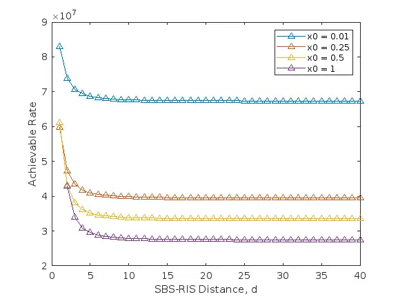 Hi everyone..... could anyone help...... I need to find th optimal value of x0 and x1 to maximize R, where x1=d-x0..........the function MATLAB code: close all; clear all; clc; % System parameters F = 10000; % Number of files S = 100; % SBS cache capacity (set to 100) M = 50; % Cash capacity fraction alpha = 2; % Path loss exponent for LOS link c = 3e8; % Light speed fr = 1e12; % Operating frequency B = 10e6; % System bandwidth epsilon = 0.8; % Skewness factor K = 0.0016; % Molecular absorption coefficient P_M = 10^(64/10); % Transmit power MBS P_S = 10^(30/10); % Transmit power SBS sigma = 10^(-90/10); % Noise power N_L = 512; N_M = 16; eta = 1; x2 =30; % RIS-MBS distance d_range = 1:1:40; R = zeros(size(d_range)); for i = 1:length(d_range) d = d_range(i); sum1 = 0; for f = 1:F sum1 = sum1 + f^(-epsilon); end sum2 = 0; for f = 1:M sum2 = sum2 + f^(-epsilon)/sum1; end sum3 = 0; for f = (M + 1):(M + (S - M) / eta) sum3 = sum3 + (f^(-epsilon)) / sum1; end sum3 = sum3 * eta; beta = (c/(4*pi*fr))^2; % Spreading loss index Rs = B * log2(1 + (P_S * beta * (d-x1)^(-alpha) * exp(-K * (d-x1))) / sigma); Rm = B * log2(1 + (P_M * (N_L^2) * N_M * (beta * (d-x0)^(-alpha) * exp(-K * (d-x0))) * (beta * x2^(-alpha) * exp(-K * x2))) / sigma); Rt = Rs * (sum2 + sum3) + Rm * (1 - (sum2 + sum3)); R(i) = Rt; end figure plot(d_range, R, 'b^-') xlabel('SBS-RIS Distance, d') ylabel('Achievable Rate')