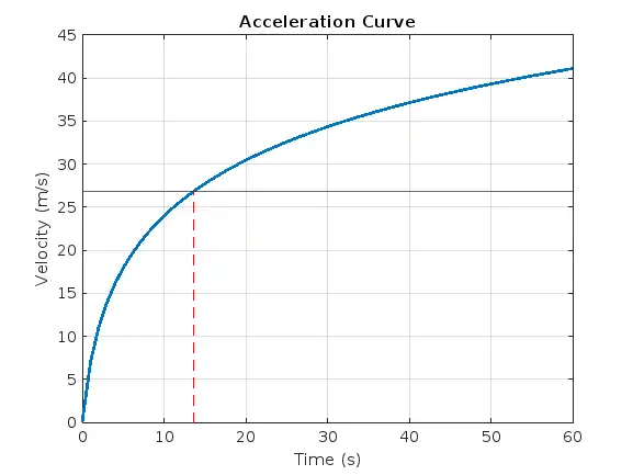 I have an acceleration curve and i need to find the 0-60mph (0-26.8224m/s) Stuck on how to get there, currently only have a yline that shows where 26.8224m/s along the y-axis. Please help! Here's my code and a picture of the graph: figure(6) P1 = plot(tout,yout(:,1)); xlabel('Time (s)') ylabel('Velocity (m/s)') grid on set(P1,'linewidth',2) title('Acceleration Curve') yline(26.8224)