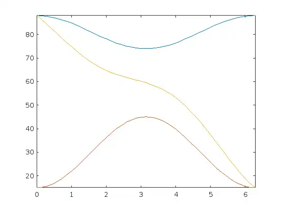 ULim = [74 88]; LLim = [0 30]; XLim = [0 2*pi]; x = linspace(XLim(1),XLim(2)); UpperFcn = @(x) (cos(x)+1)/2*diff(ULim) + ULim(1); LowerFcn = @(x) (1-(cos(x))/2)*diff(LLim) + LLim(1); fplot(UpperFcn,XLim) hold on fplot(LowerFcn,XLim)