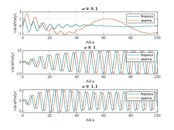 My assignment would be to observe harmonic oscillator. I have created a function for the driven oscillator's equation of motion. My problem is that now my code is plotting the results of the differential equation, but I would like to plot the oscillator's place which is marked as x_2. So it should be that the figures should plot the place of the oscillator. The oscillator is starting from the rest in the beginning. Thus, In the figure 1: the place of the oscillator, which is starting from the rest. In the figure 2: the place of the oscillator with the values of the parameter ω ∈ {0.1, 1.0, 1.1}. The others parameters' valeus stay the same. So, my question is that how could I get the place out of the function for the driven oscillator? Here is my function for the driven oscillator: function dx=DrivenOsc(t,x,T0,omega,M,F,omega0)dx = [-1/T0*x(1)-omega0^2*x(2)+F/M*cos(omega*t);x(1)]; Here is my code for the plotting: clear all close all T0 = 10; omega0 = 1; M = 1; F = 1; omega = 1; t = 0; x_1 = 0; x_2 = 0; x = [x_1 x_2]; t=0:0.01:10*T0; options=[]; options=odeset(options,'RelTol',1e-7,'AbsTol',1e-7); [tout,yout]=ode45(@DrivenOsc,t,x,options,T0,omega,M,F,omega0); figure(1) plot(tout,yout); xlabel('Aika'); ylabel('Värähtelyt'); grid on figure(2) subplot(3,1,1) T0 = 10; omega0 = 1; M = 1; F = 1; omega = 0.1; t = 0; x_1 = 0; x_2 = 0; x = [x_1 x_2]; t=0:0.01:10*T0; options=[]; options=odeset(options,'RelTol',1e-7,'AbsTol',1e-7); [tout,yout]=ode45(@DrivenOsc,t,x,options,T0,omega,M,F,omega0); plot(tout,yout); xlabel('Aika'); ylabel('Värähtelyt'); grid on subplot(3,1,2) T0 = 10; omega0 = 1; M = 1; F = 1; omega = 1.0; t = 0; x_1 = 0; x_2 = 0; x = [x_1 x_2]; t=0:0.01:10*T0; options=[]; options=odeset(options,'RelTol',1e-7,'AbsTol',1e-7); [tout,yout]=ode45(@DrivenOsc,t,x,options,T0,omega,M,F,omega0); plot(tout,yout); xlabel('Aika'); ylabel('Värähtelyt'); grid on subplot(3,1,3) T0 = 10; omega0 = 1; M = 1; F = 1; omega = 1.1; t = 0; x_1 = 0; x_2 = 0; x = [x_1 x_2]; t=0:0.01:10*T0; options=[]; options=odeset(options,'RelTol',1e-7,'AbsTol',1e-7); [tout,yout]=ode45(@DrivenOsc,t,x,options,T0,omega,M,F,omega0); plot(tout,yout); xlabel('Aika'); ylabel('Värähtelyt'); grid on