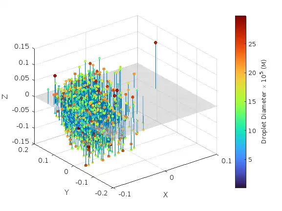 scatter3(droplets.('X-Coord'), droplets.('Y-Coord'), droplets.('Z-Coord'), droplets.Diameter*1E5, droplets.Diameter*1E5, 'filled')