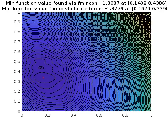 f = @(x) [x(1) x(2)]*[10 2;2 6]*[x(1);x(2)]-[5 5]*[x(1);x(2)]+(cos(30*x(1))+cos(30*x(2)))/40+(cos(80*x(1)^2)+cos(80*x(2)^2))/50; options = optimoptions(@fmincon); %options = optimoptions(@fmincon,'Display','iter','OptimalityTolerance',1e-12); lb = [0 0];% lower bounds ub = [1 1];% upper bounds x0 = [.5 .5]; % initial guess [xSol,fval,exitflag,output] = fmincon(f,x0,[],[],[],[],lb,ub,[],options); % solve optimization