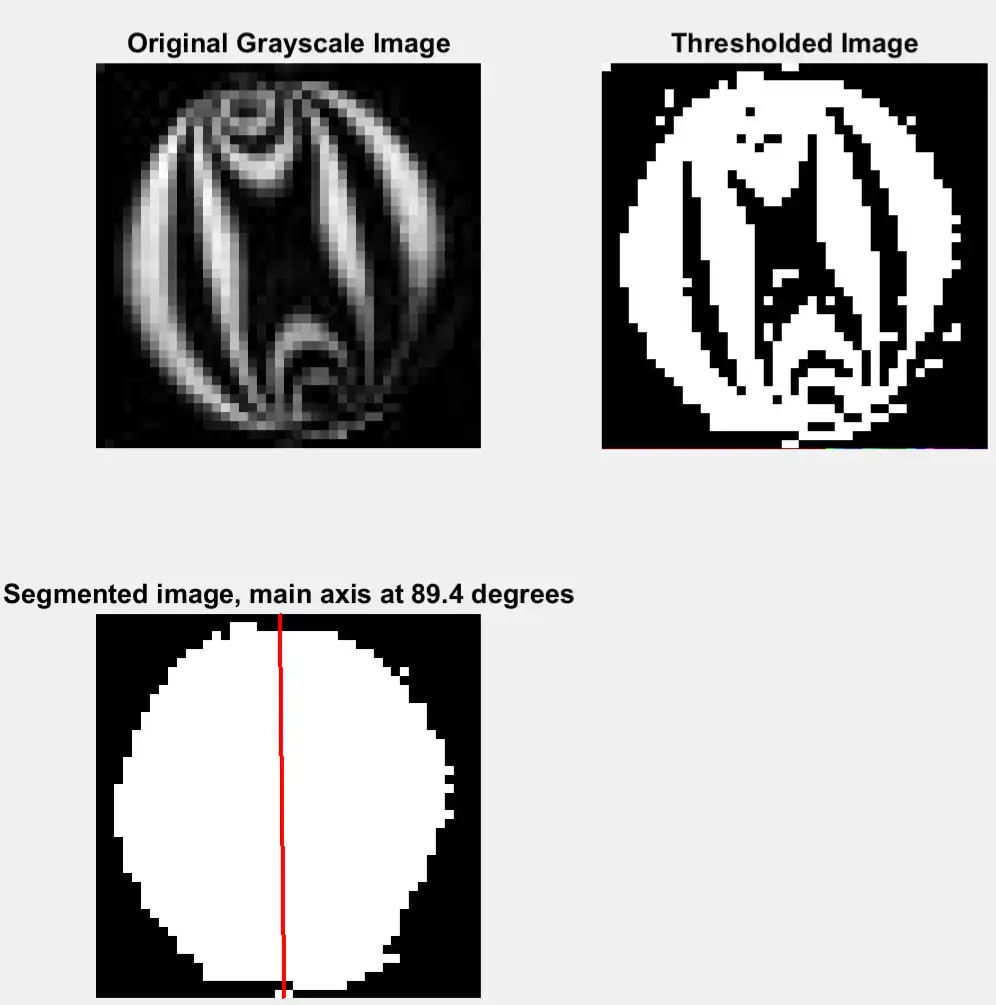 caption = sprintf('Segmented image, main axis at %.1f degrees', orientation);