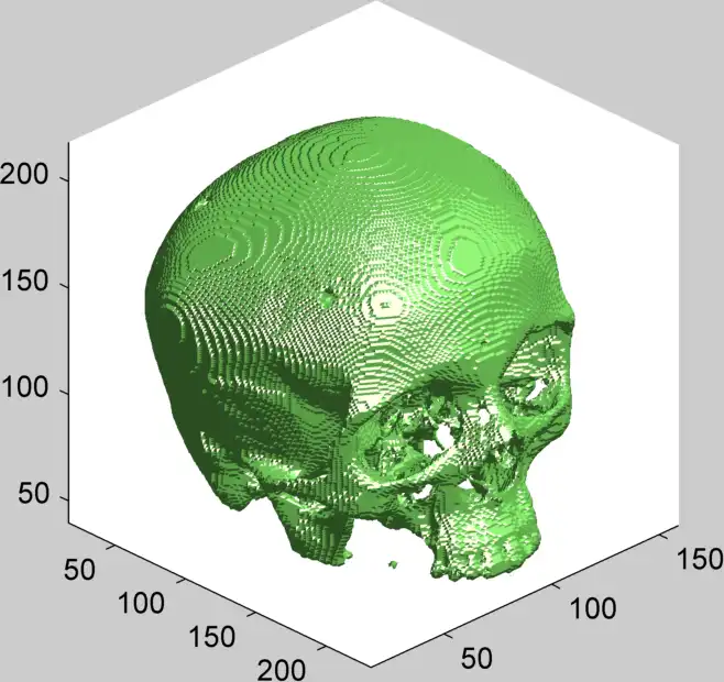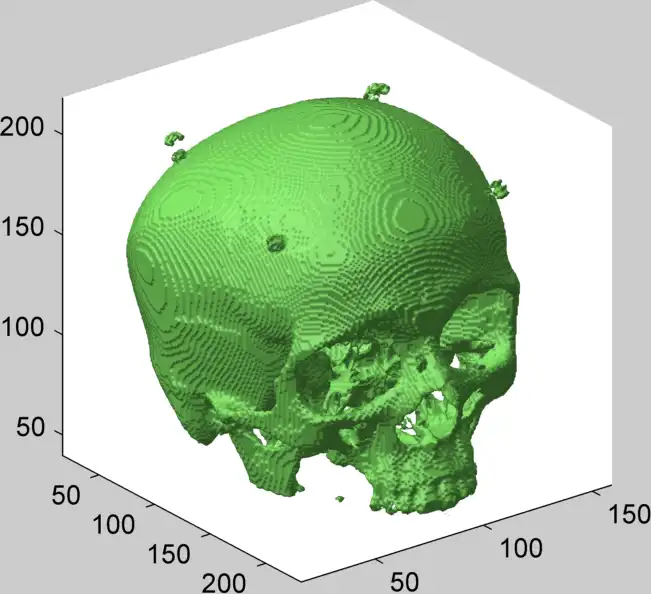 clc % clear command window cla % clear axes bi11 = bi; % create copy of 'bi' bi1 = bi(:,:,170:end); % get top part R = 2; % radius of structuring element [x,y,z] = meshgrid(-R:R); % X Y Z 3d matrices el = x.^2+y.^2+z.^2 <= R^2; % sphere of radius 'R' bi2 = imerode(bi1, el); % erode image bi3 = imdilate(bi2, el); % dilate image bi11(:,:,170:end) = bi3; % replace original top part isosurface(bi11,.95) % display 3d image axis vis3d light