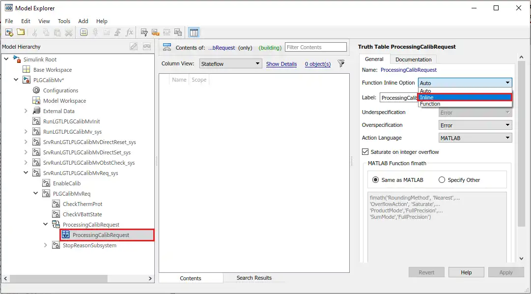 - In the Model Hierarchy, search for the Functions or Truth Tables that are defined inside of a Stateflow chart as in the following example: