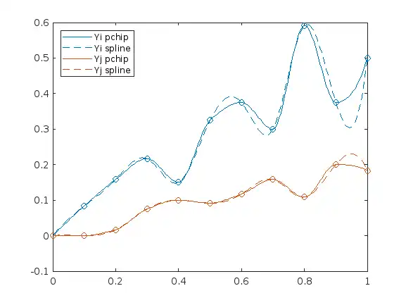 x= [0,0.1,0.2,0.3,0.4,0.5,0.6,0.7,0.8,0.9,1]; y1 = [0 0.0833 0.1583 0.2167 0.1500 0.3250 0.3750 0.3000 0.5917 0.3750 0.5000]; y2= [ 0 0 0.0167 0.0750 0.1000 0.0917 0.1167 0.1583 0.1083 0.2000 0.1833]; figure plot (x,y1,'o') hold on plot (x,y2,'o') Xi = 0:0.005:1; Yi = pchip(x,y1,Xi); Yi_spline = spline(x,y1,Xi); h(1) = plot(Xi,Yi,'-','color',lines(1)); h(2) = plot(Xi, Yi_spline, '--', 'color', lines(1)); Yj = pchip(x,y2,Xi); Yj_spline = spline(x, y2, Xi); h(3) = plot(Xi,Yj,'-','color',[0.85, 0.325, 0.098]); h(4) = plot(Xi,Yj_spline,'--','color',[0.85, 0.325, 0.098]); legend(h, "Yi pchip", "Yi spline", "Yj pchip", "Yj spline", "location", "NW")