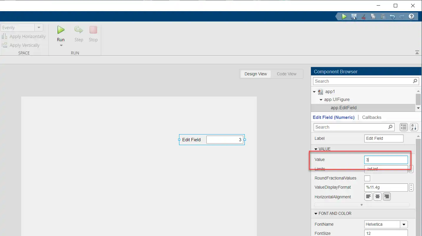 Hello, I have an Edit Field box on the Design view and I opened a callback in the Code View. There is a default value in the Edit Field box that I would like to be used automatically when a user runs the app. I have this: % Value changed function: LengthEditField function LengthEditFieldValueChanged(app, event) app.L = app.LengthEditField.Value; if isempty(app.L) new_value = 3; % set default value to 3 end app.L=new_value; end But when I use this variable in an equation, it tells me that its "empty (0x0) double". How do I get it to display a value of 3 for example ?